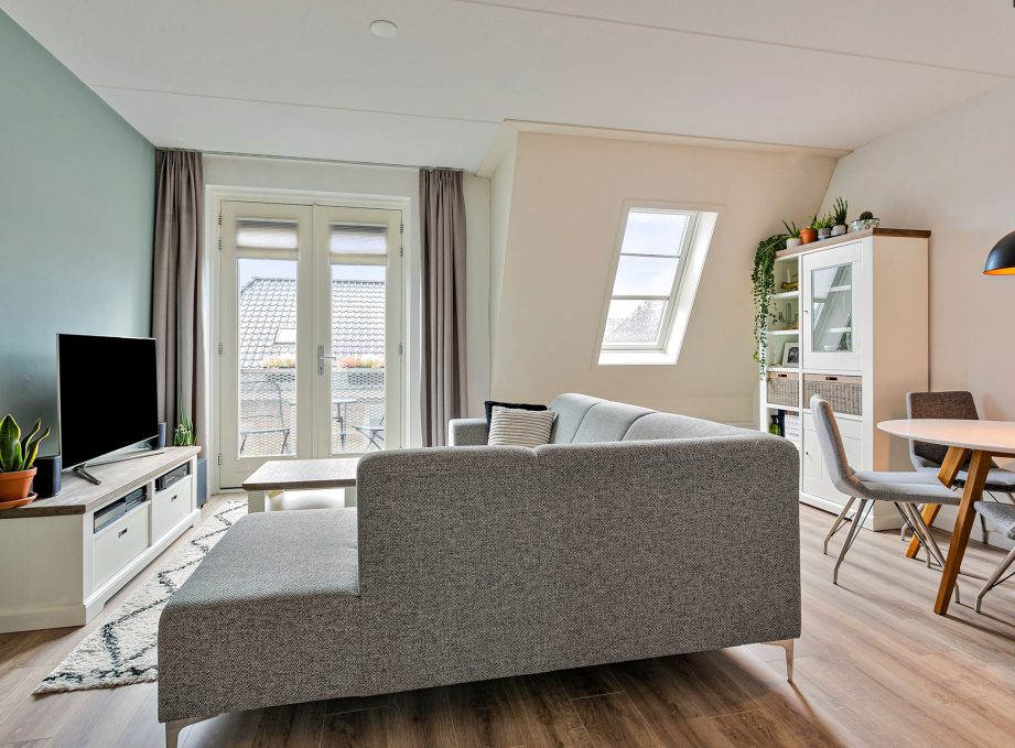 Woonkamer met mooie laminaatvloer en toegang tot het balkon